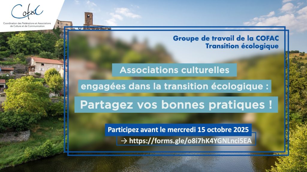 Cher amis de la fête, Partagez vos bonnes pratiques écologiques dans la culture ! La transition écologique est déjà à l’œuvre dans le secteur culturel, et de nombreuses associations agissent concrètement au quotidien, partout sur le territoire. Le groupe de travail « Transition écologique » de la COFAC souhaite mieux connaître vos pratiques, idées et questionnements, afin de les valoriser et de construire ensemble des réponses adaptées. Cette enquête est ouverte à toutes les associations culturelles, qu’elles soient ou non membres de la COFAC ou de la FNCOF. Vos réponses permettront de : • dresser un état des lieux des initiatives et réflexions du secteur culturel associatif, • recenser et valoriser les bonnes pratiques pour les partager plus largement. Répondez dès maintenant (en moins de 15 min) avant le mercredi 15 octobre. Et surtout : faites-la circuler autour de vous ! |